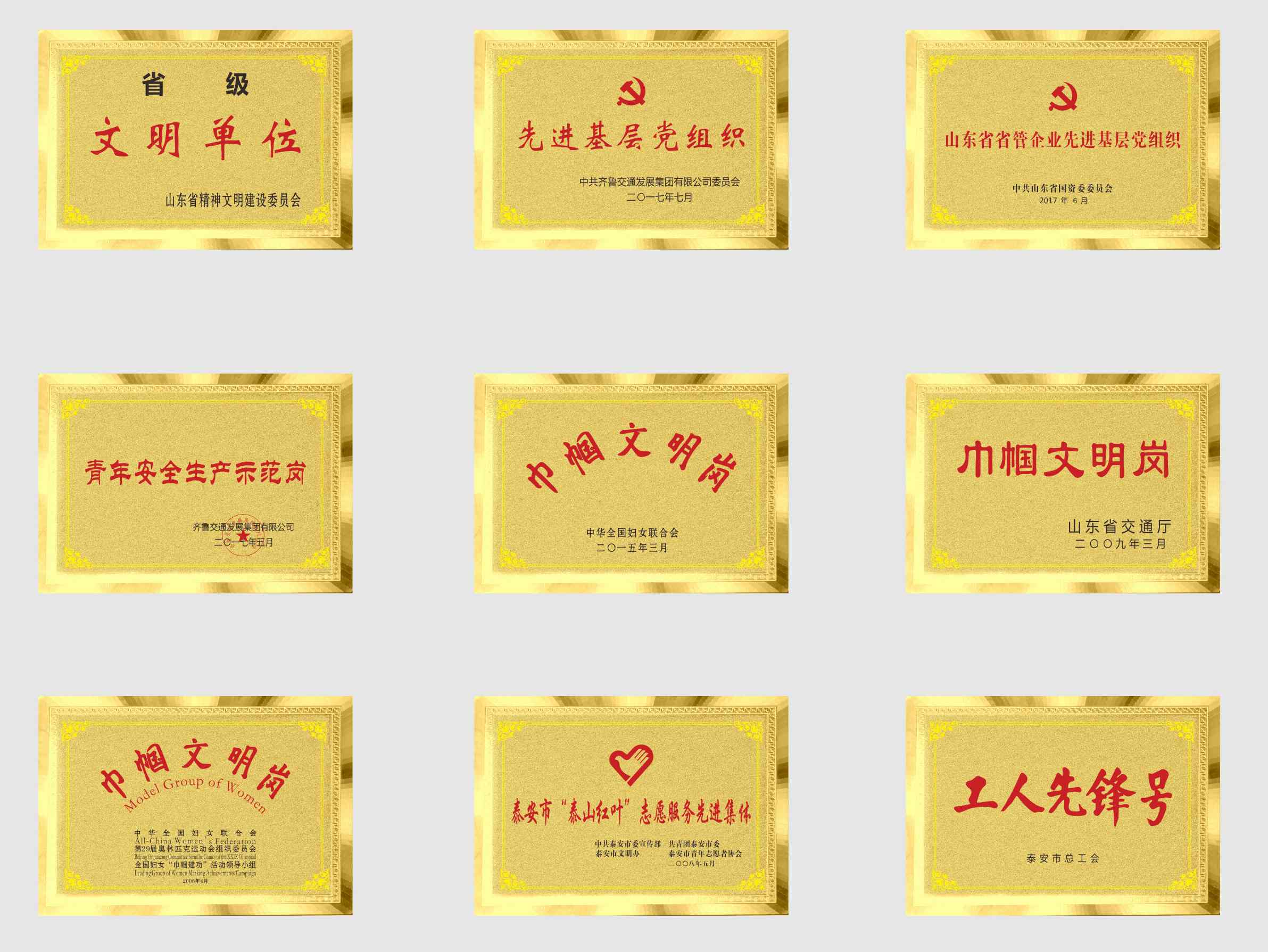 近年来,山东高速泰安发展有限公司连续多年保持省级文明单位称号,泰安南、泰安收费站分别于2008年、2015年被表彰为国家级“巾帼文明岗”;所辖收费站分别被省总工会、共青团山东省委、省交通厅授予“工人先锋号”、“青年文明号”、“巾帼文明岗”等荣誉称号。公司团委被集团表彰为“五四红旗团委”,四个基层党支部分别被省国资委党委、集团公司党委授予“先进基层党组织”、过硬党支部示范点;公司工会被山东省交通工会评为“职工信赖的职工之家”,被集团工会评为“模范职工之家”。公司以及两名先进个人先后荣获集团“董事长特别奖”;三名同志分别荣获2019年度山东省交通运输系统先进个人、集团公司第一、二届劳动模范。泰安东站、运行调度管理中心应急调度中队分别被评为全国交通运输行业“五星级现场”和“质量信得过班组”;“叮咚”、“飞跃”两个QC小组和三个基层班组分别荣获山东省交通行业优秀质量管理小组二、三等奖和质量信得过班组。